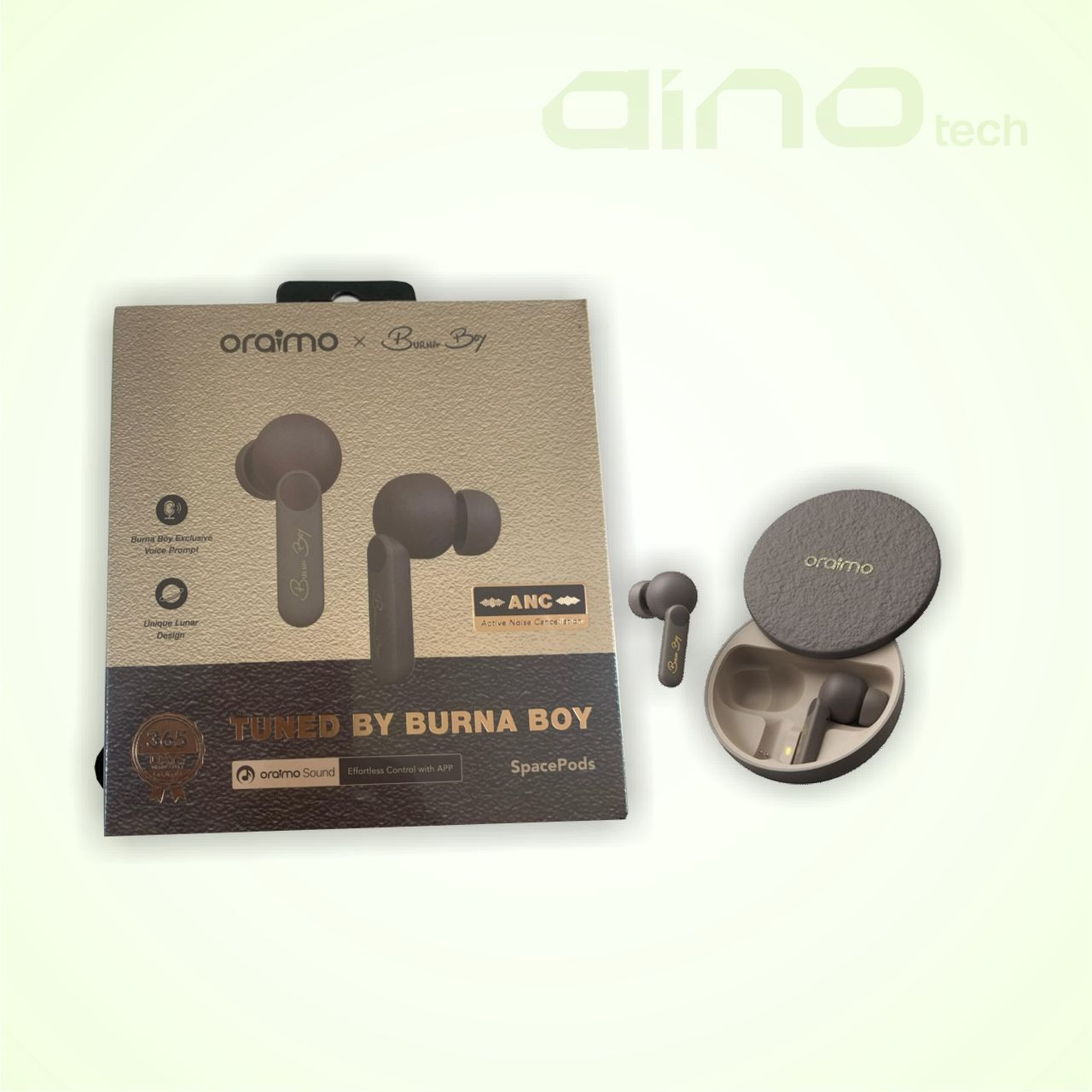 THE ORAIMO TUNED BY BURNA BOY SPACEPODS ARE TRUE WIRELESS EARBUDS FEATURING A UNIQUE LUNAR DESIGN INSPIRED BY THE MOON, CRAFTED THROUGH EXTENSIVE POLISHING AND CARVING TO CREATE A SIMULATED LUNAR SURFACE TEXTURE; THEY OFFER A PREMIUM LISTENING EXPERIENCE WITH A SPECIAL AFROBEAT TUNING CURATED BY GRAMMY AWARD-WINNING ARTIST BURNA BOY, PROVIDING AN UNPARALLELED EXPERIENCE OF MUSIC'S DEPTH AND RICHNESS; THE EARBUDS INCLUDE BURNA BOY'S EXCLUSIVE VOICE PROMPTS TO ACCOMPANY USERS WHEN SWITCHING BETWEEN DIFFERENT LISTENING MODES SUCH AS NOISE CANCELLATION, GAME MODE, AND TRANSPARENCY; THEY FEATURE ACTIVE NOISE CANCELLATION (ANC) TO PROVIDE A QUIET AND IMMERSIVE LISTENING ENVIRONMENT; THE SPACEPODS SUPPORT TRANSPARENCY MODE, ALLOWING USERS TO STAY AWARE OF THEIR SURROUNDINGS OR ENGAGE IN SHORT CONVERSATIONS WITHOUT REMOVING THE EARBUDS; THEY INCORPORATE HavyBass™ ALGORITHM WITH 10MM DYNAMIC DRIVERS AND COMPOSITE DIAPHRAGMS TO DELIVER POWERFUL BEATS AND DEEP BASS; THE EARBUDS PROVIDE UP TO 8.5 HOURS OF PLAYTIME ON A SINGLE CHARGE, WITH THE CHARGING CASE OFFERING AN ADDITIONAL 27 HOURS OF USAGE; THEY FEATURE IPX5 WATERPROOF RATING, MAKING THEM RESISTANT TO SWEAT AND LIGHT RAIN, IDEAL FOR WORKOUTS AND OUTDOOR ACTIVITIES.